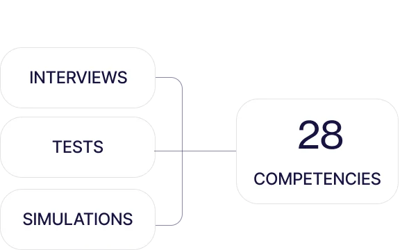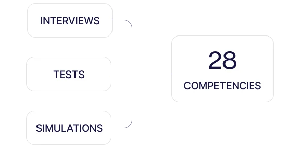 Each assessment uses interviews, psychometrics, and simulations to evaluate 28 key competencies across core, leadership, and future-ready areas