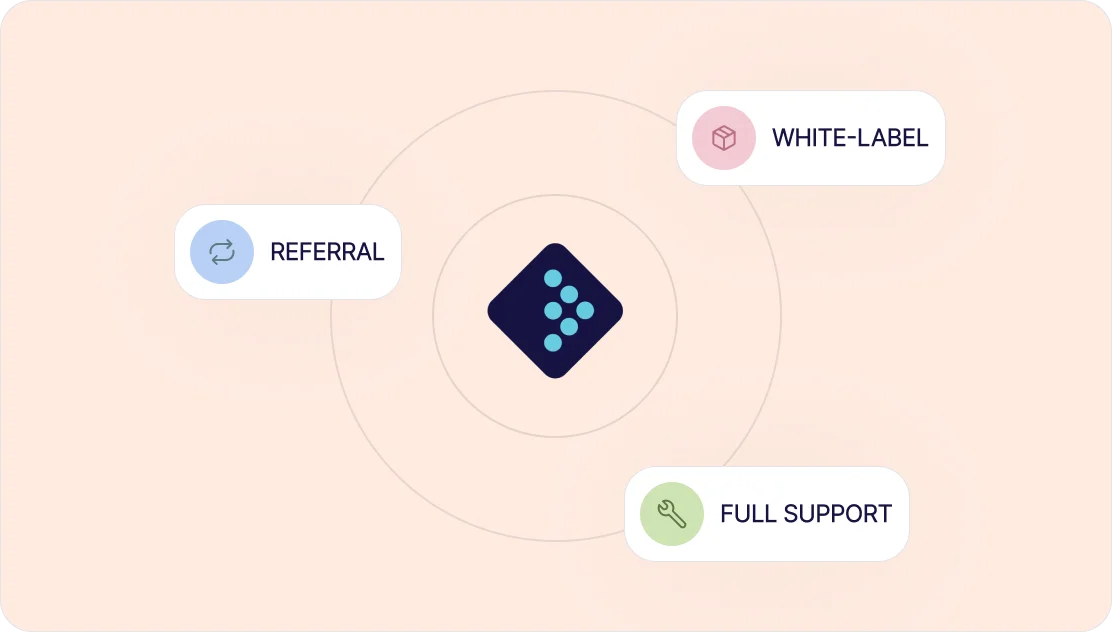Choose between white-labeled solutions, referral-based reselling, or full implementation support depending on your business model.